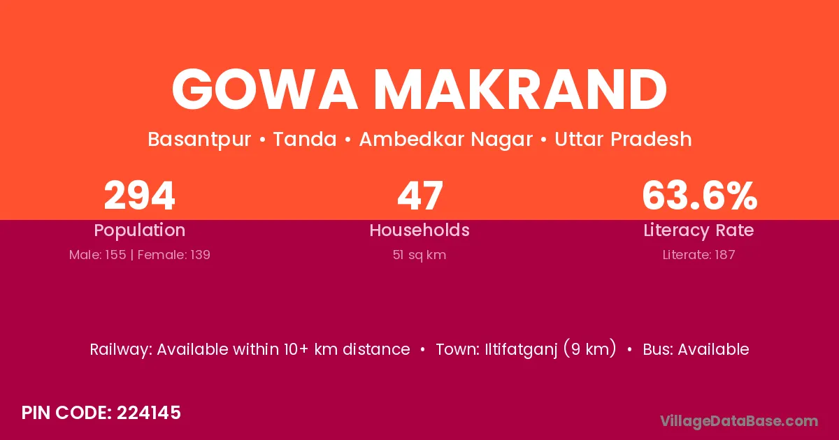 Gowa Makrand village has a total population of 294 people, of which 155 are males and 139 are females.