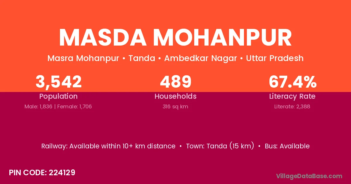 Tanda (15 km) is the nearest town to Masda Mohanpur village for major economic activities and is located approximately 15 km away.