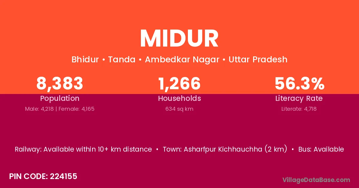 Asharfpur Kichhauchha (2 km) is the nearest town to Midur village for major economic activities and is located approximately 2 km away.