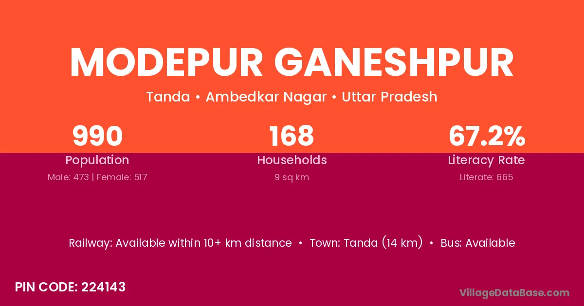Tanda (14 km) is the nearest town to Modepur Ganeshpur village for major economic activities and is located approximately 14 km away.