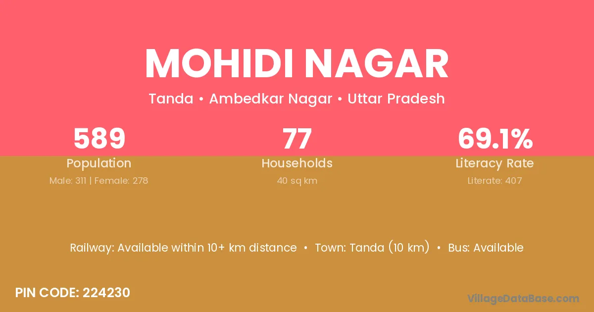 Tanda (10 km) is the nearest town to Mohidi Nagar village for major economic activities and is located approximately 10 km away.