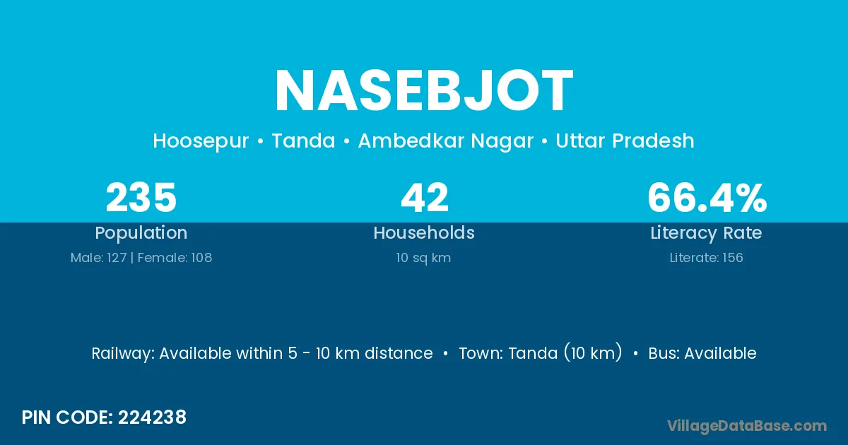Tanda (10 km) is the nearest town to Nasebjot village for major economic activities and is located approximately 10 km away.