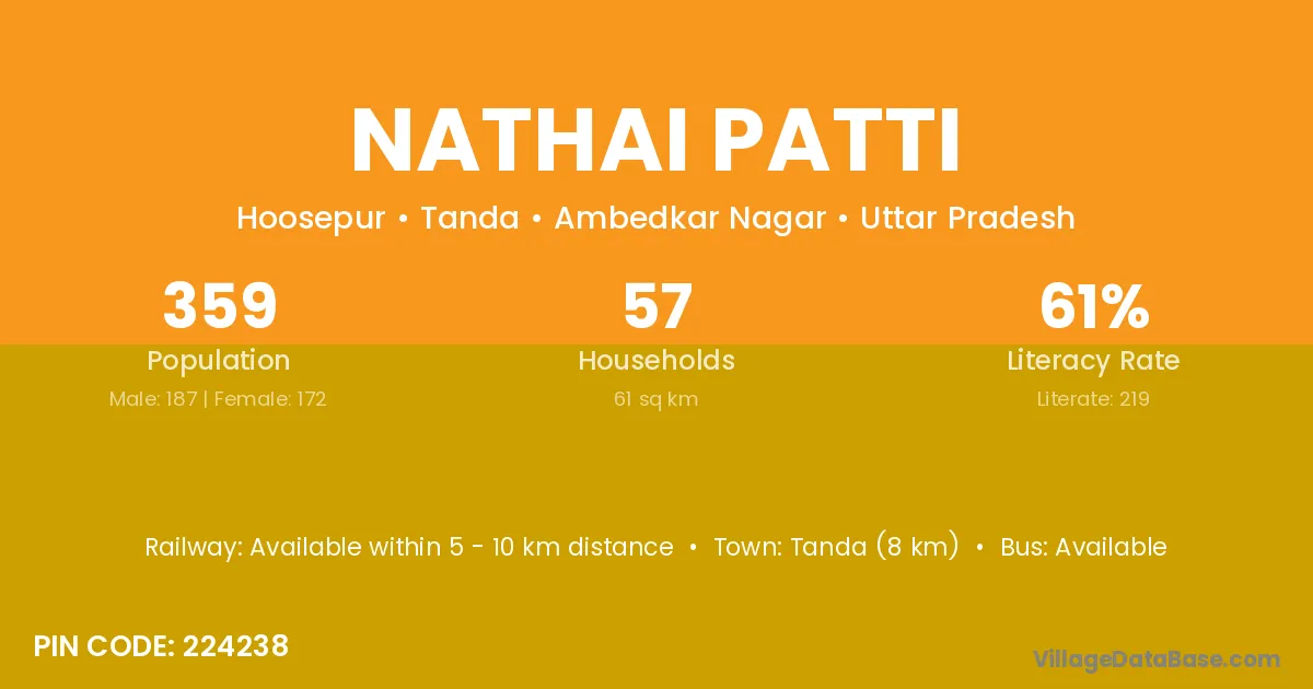 Tanda (8 km) is the nearest town to Nathai Patti village for major economic activities and is located approximately 8 km away.
