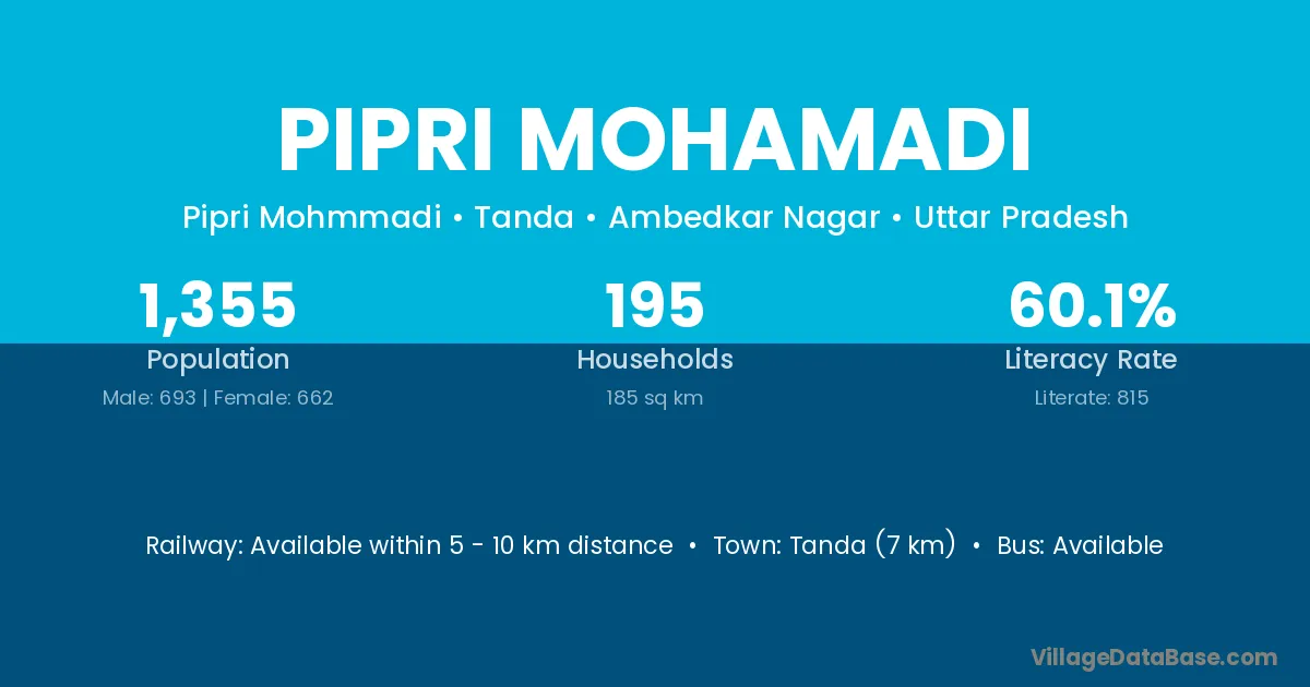 Tanda (7 km) is the nearest town to Pipri Mohamadi village for major economic activities and is located approximately 7 km away.