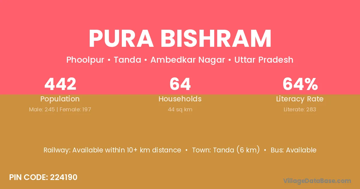 Tanda (6 km) is the nearest town to Pura Bishram village for major economic activities and is located approximately 6 km away.