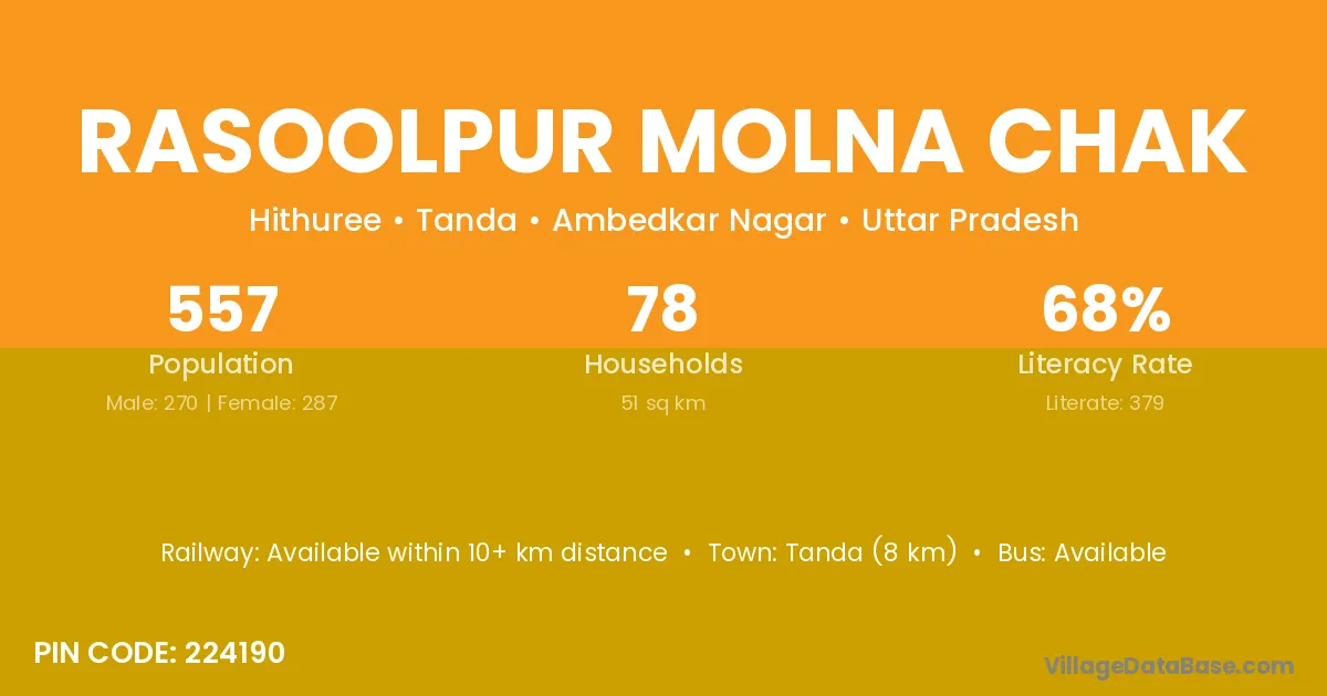 Tanda (8 km) is the nearest town to Rasoolpur Molna Chak village for major economic activities and is located approximately 8 km away.