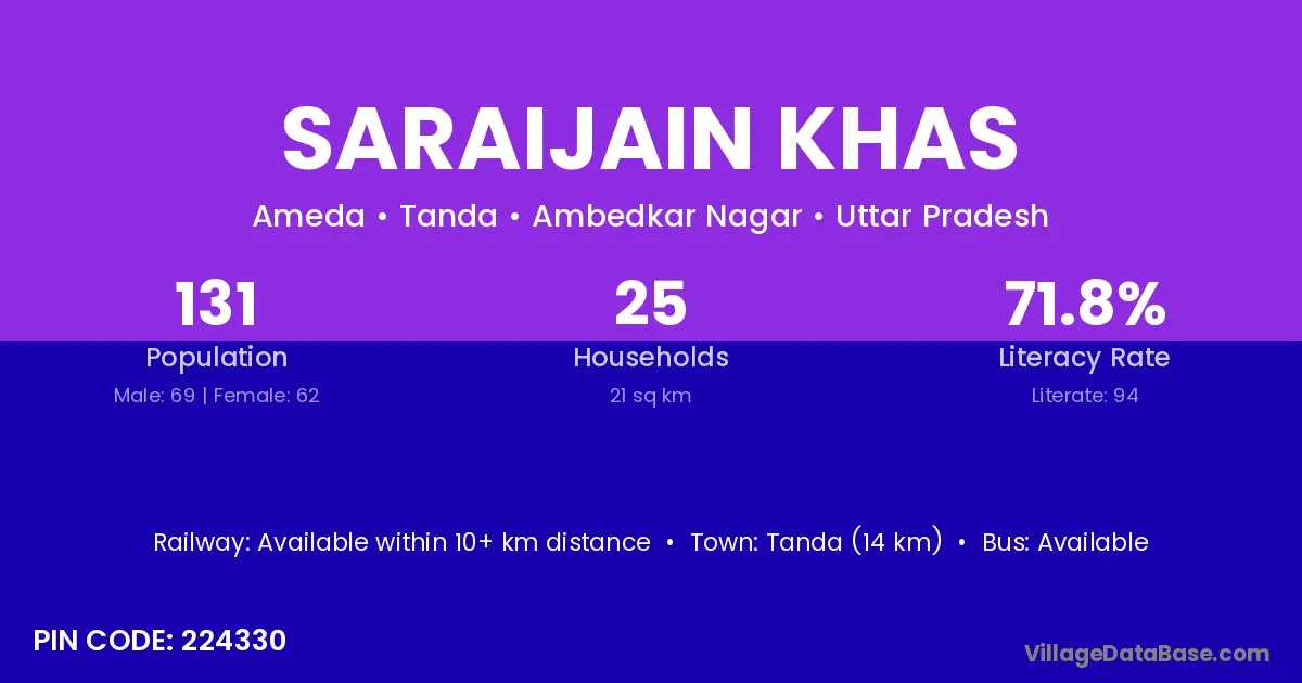 Tanda (14 km) is the nearest town to Saraijain Khas village for major economic activities and is located approximately 14 km away.