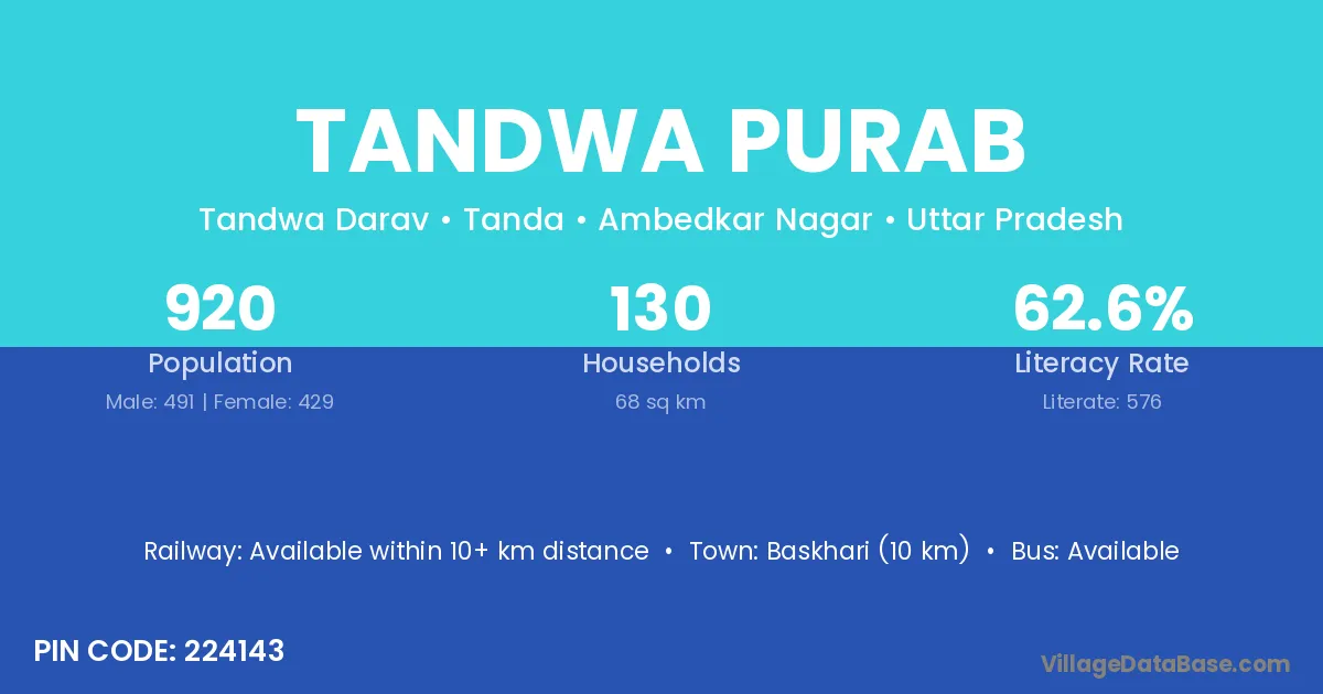 Tandwa Purab village has a total population of 920 people, of which 491 are males and 429 are females.