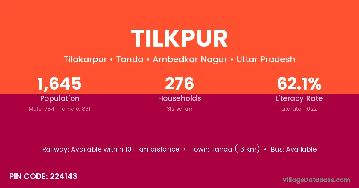 Tanda (16 km) is the nearest town to Tilkpur village for major economic activities and is located approximately 16 km away.