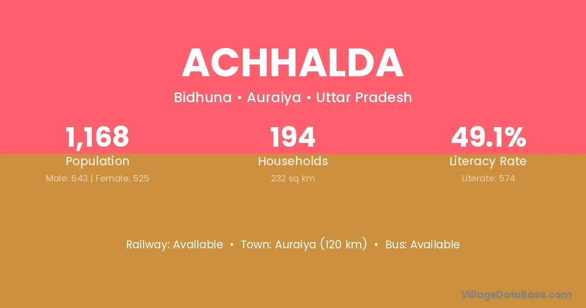 Auraiya (120 km) is the nearest town to Achhalda village for major economic activities and is located approximately 120 km away.