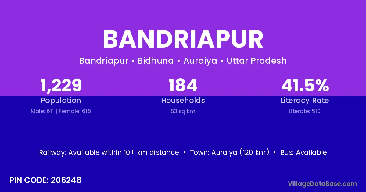 Auraiya (120 km) is the nearest town to Bandriapur village for major economic activities and is located approximately 120 km away.