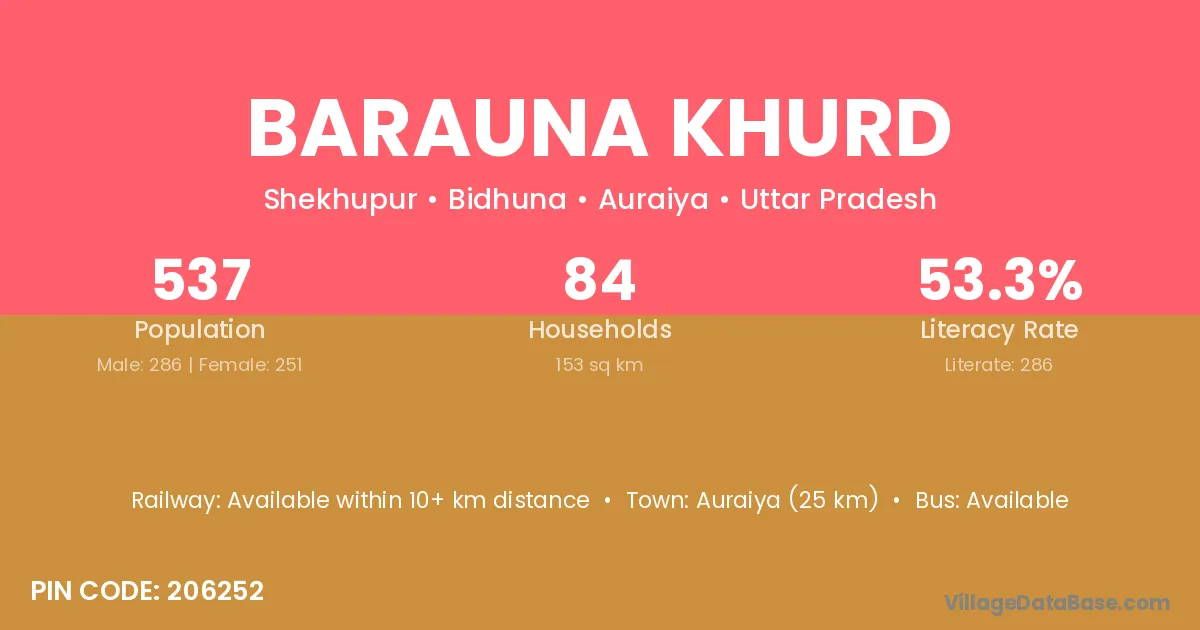 Auraiya (25 km) is the nearest town to Barauna Khurd village for major economic activities and is located approximately 25 km away.