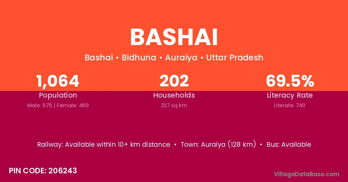 Auraiya (128 km) is the nearest town to Bashai village for major economic activities and is located approximately 128 km away.