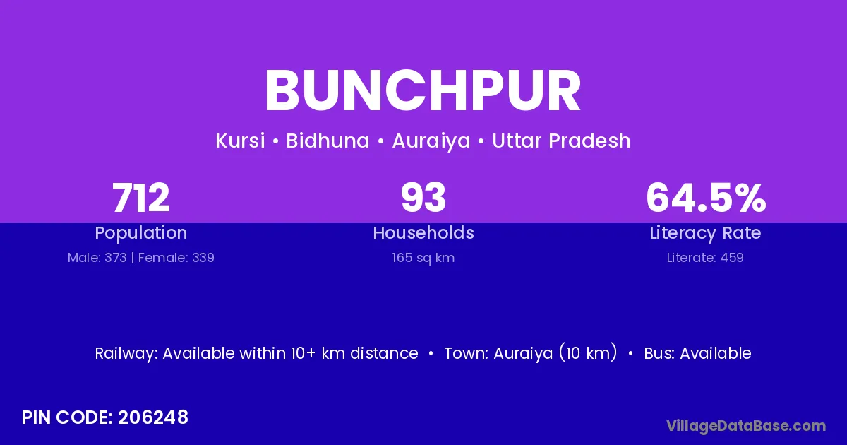 Auraiya (10 km) is the nearest town to Bunchpur village for major economic activities and is located approximately 10 km away.
