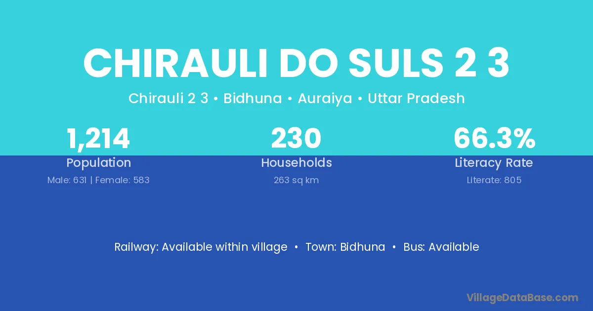 Chirauli Do Suls 2 3 village has a total population of 1,214 people, of which 631 are males and 583 are females.