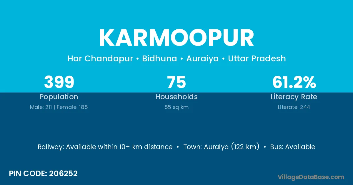 Auraiya (122 km) is the nearest town to Karmoopur village for major economic activities and is located approximately 122 km away.