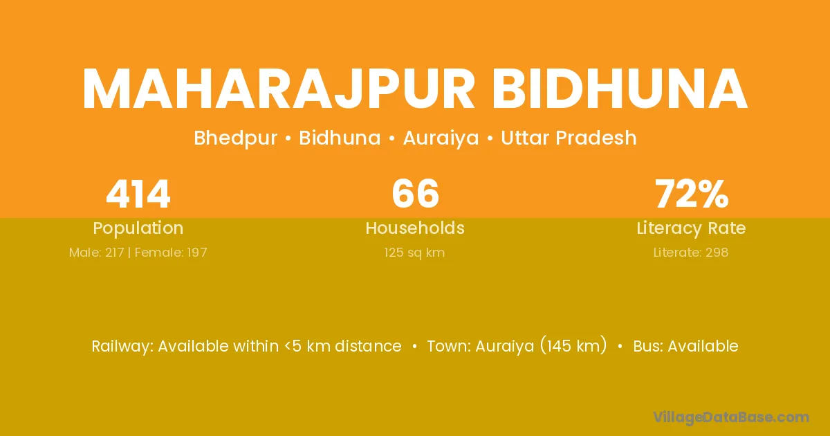Auraiya (145 km) is the nearest town to Maharajpur Bidhuna village for major economic activities and is located approximately 145 km away.
