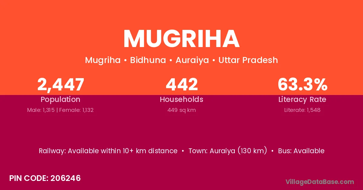 Auraiya (130 km) is the nearest town to Mugriha village for major economic activities and is located approximately 130 km away.