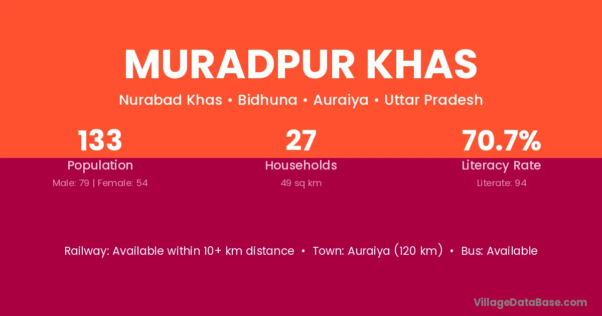 Auraiya (120 km) is the nearest town to Muradpur Khas village for major economic activities and is located approximately 120 km away.