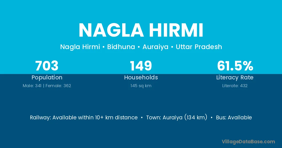 Auraiya (134 km) is the nearest town to Nagla Hirmi village for major economic activities and is located approximately 134 km away.