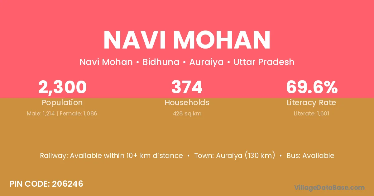 Auraiya (130 km) is the nearest town to Navi Mohan village for major economic activities and is located approximately 130 km away.