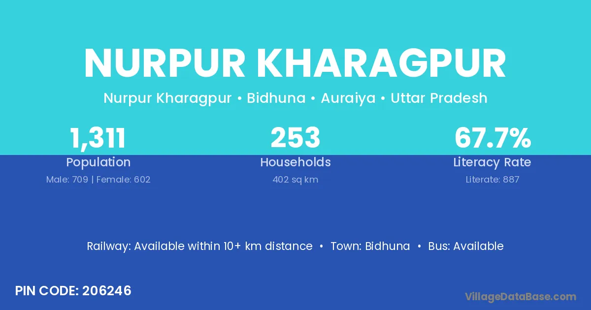Nurpur Kharagpur village has a total population of 1,311 people, of which 709 are males and 602 are females.
