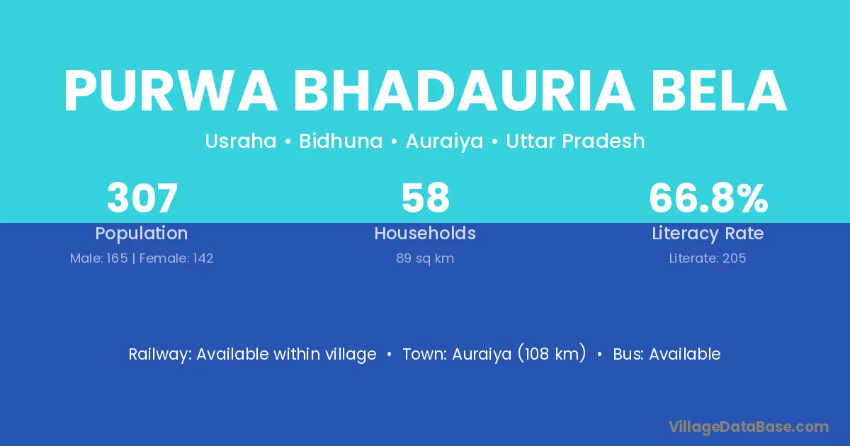Purwa Bhadauria Bela village has a total population of 307 people, of which 165 are males and 142 are females.