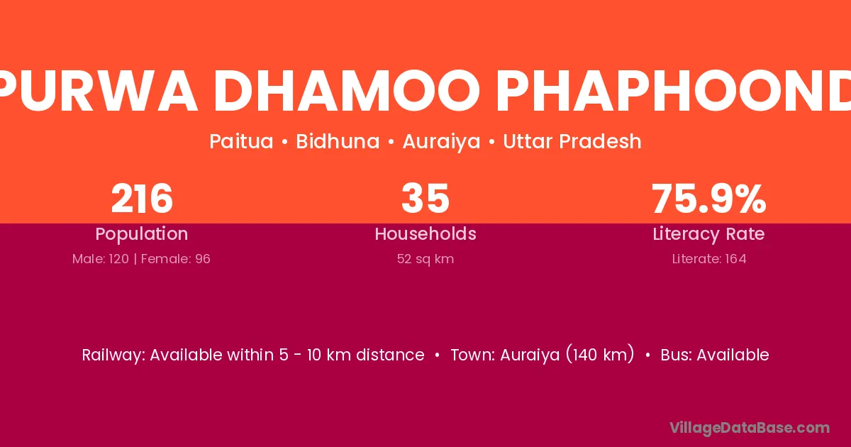 Purwa Dhamoo Phaphoond village has a total population of 216 people, of which 120 are males and 96 are females.