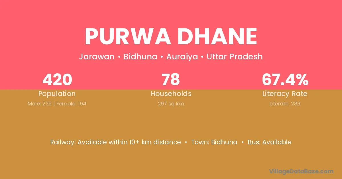 Purwa Dhane village has a total population of 420 people, of which 226 are males and 194 are females.