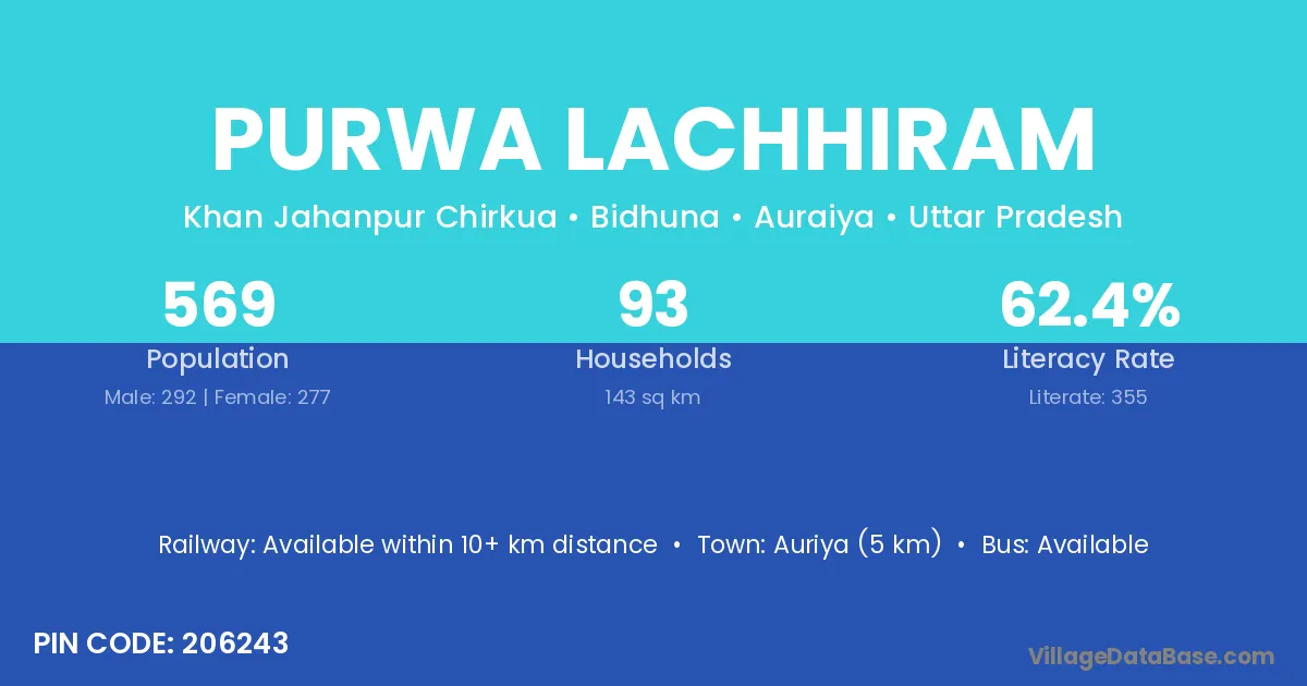 Auriya (5 km) is the nearest town to Purwa Lachhiram village for major economic activities and is located approximately 5 km away.