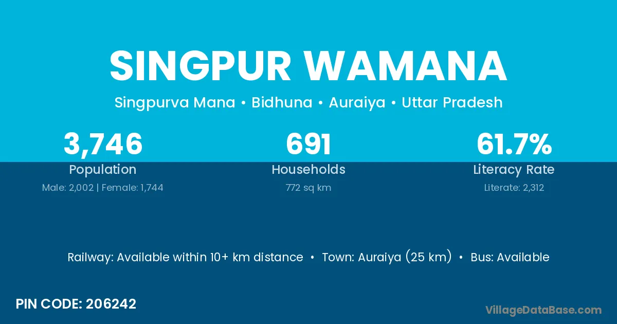 Auraiya (25 km) is the nearest town to Singpur Wamana village for major economic activities and is located approximately 25 km away.
