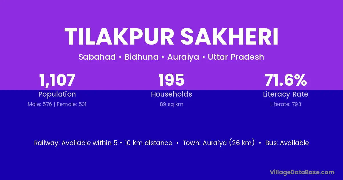 Auraiya (26 km) is the nearest town to Tilakpur Sakheri village for major economic activities and is located approximately 26 km away.