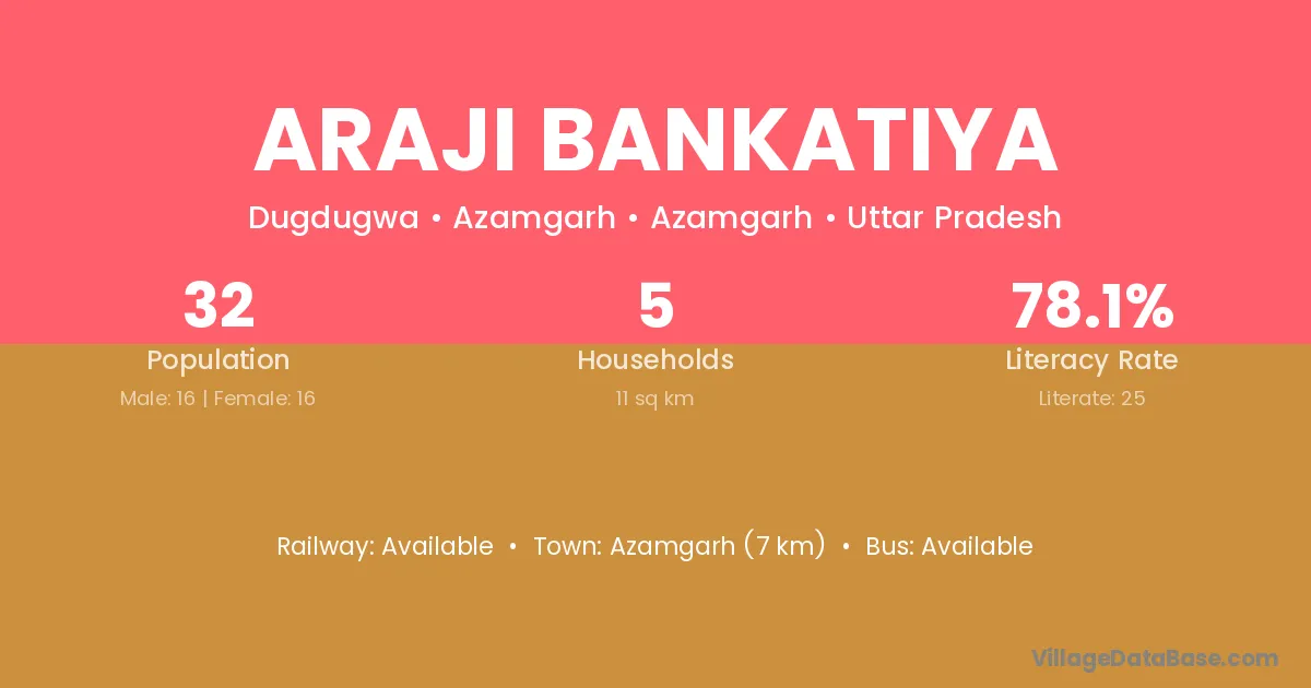 Azamgarh (7 km) is the nearest town to Araji Bankatiya village for major economic activities and is located approximately 7 km away.