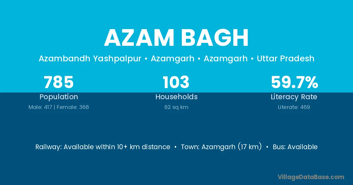 Azamgarh (17 km) is the nearest town to Azam Bagh village for major economic activities and is located approximately 17 km away.