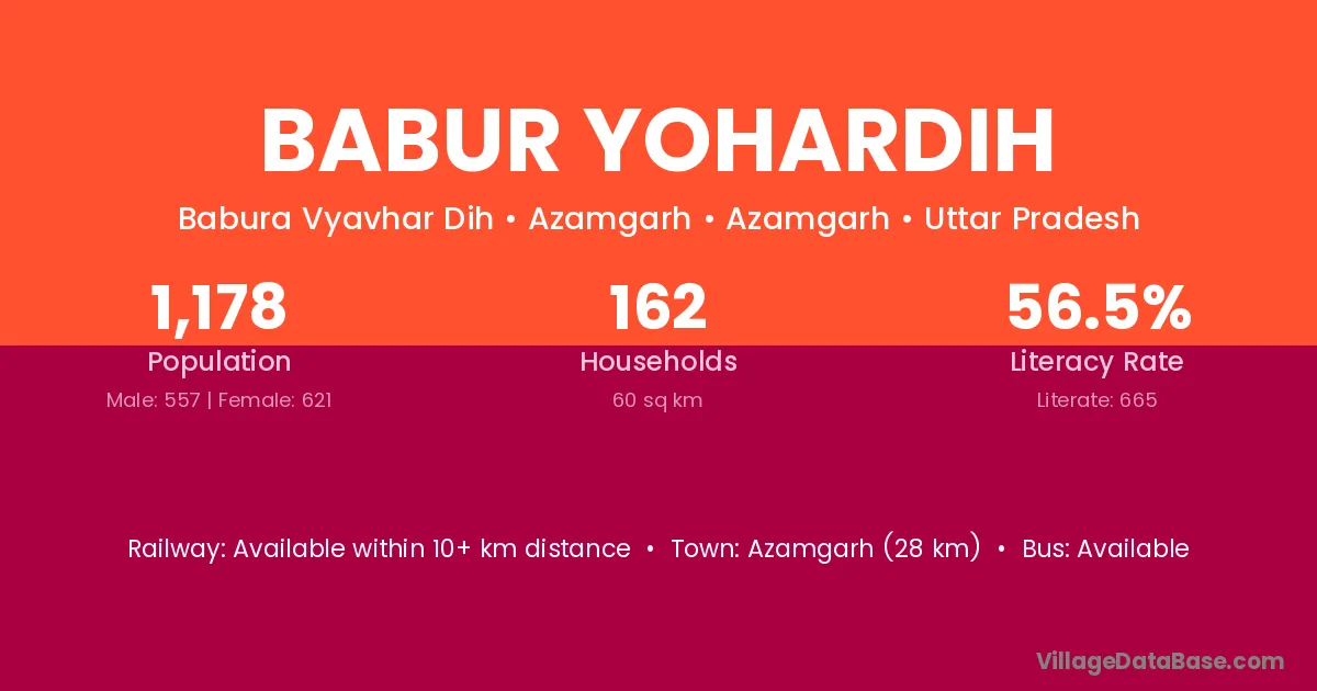 Azamgarh (28 km) is the nearest town to Babur Yohardih village for major economic activities and is located approximately 28 km away.