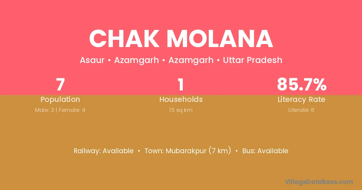 Mubarakpur (7 km) is the nearest town to Chak Molana village for major economic activities and is located approximately 7 km away.
