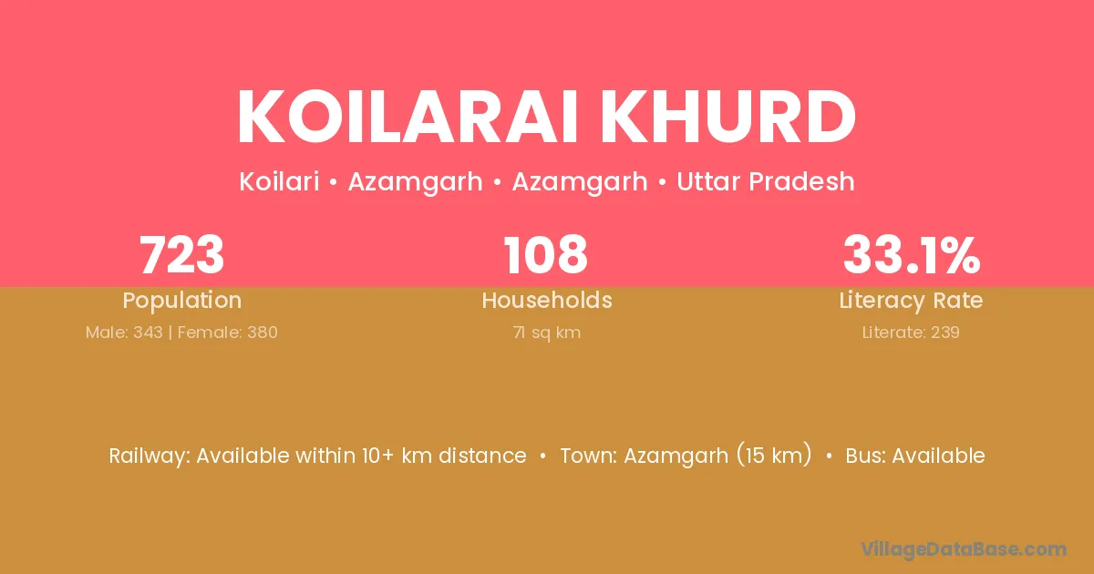 Azamgarh (15 km) is the nearest town to Koilarai Khurd village for major economic activities and is located approximately 15 km away.