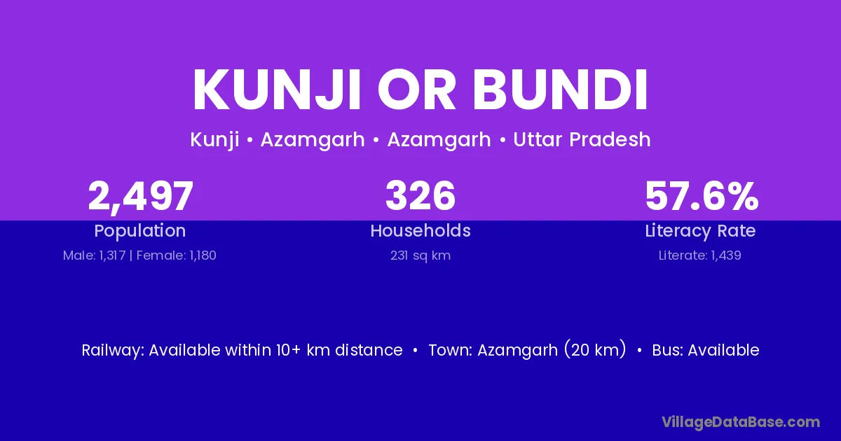 Azamgarh (20 km) is the nearest town to Kunji Or Bundi village for major economic activities and is located approximately 20 km away.