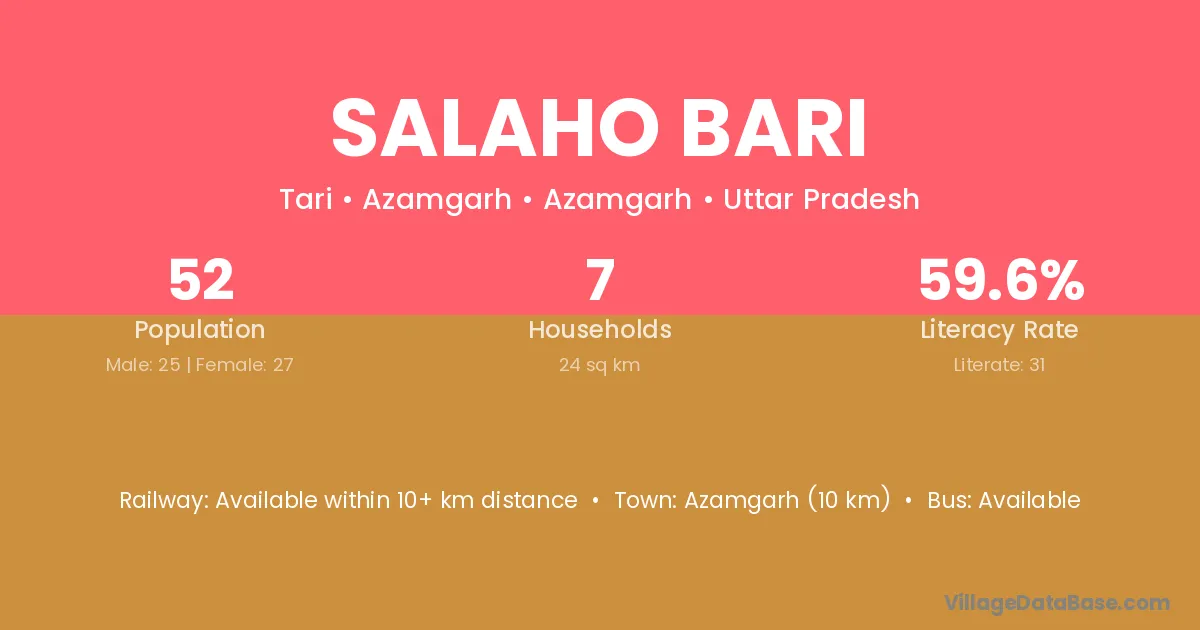 Azamgarh (10 km) is the nearest town to Salaho Bari village for major economic activities and is located approximately 10 km away.