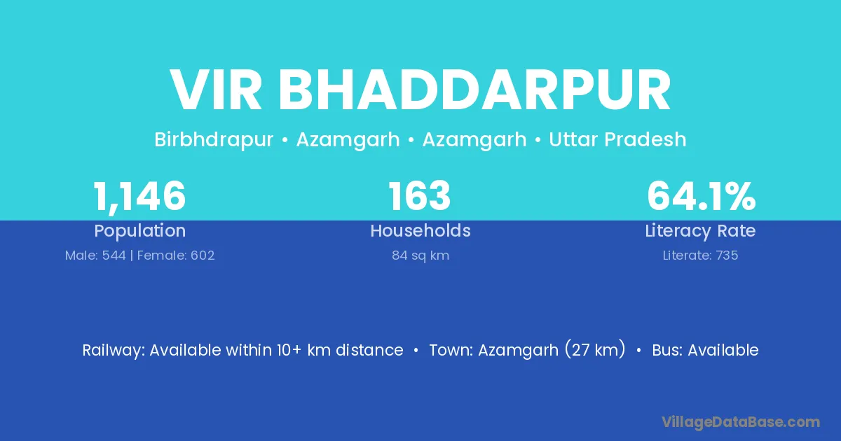 Azamgarh (27 km) is the nearest town to Vir Bhaddarpur village for major economic activities and is located approximately 27 km away.