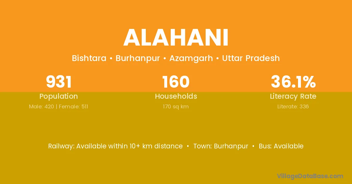 Alahani village has a total population of 931 people, of which 420 are males and 511 are females.
