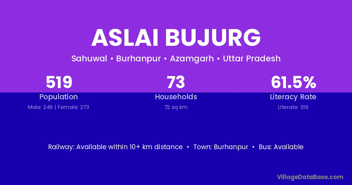 Burhanpur is the nearest town to Aslai Bujurg village for major economic activities