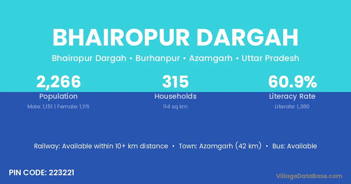 Azamgarh (42 km) is the nearest town to Bhairopur Dargah village for major economic activities and is located approximately 42 km away.