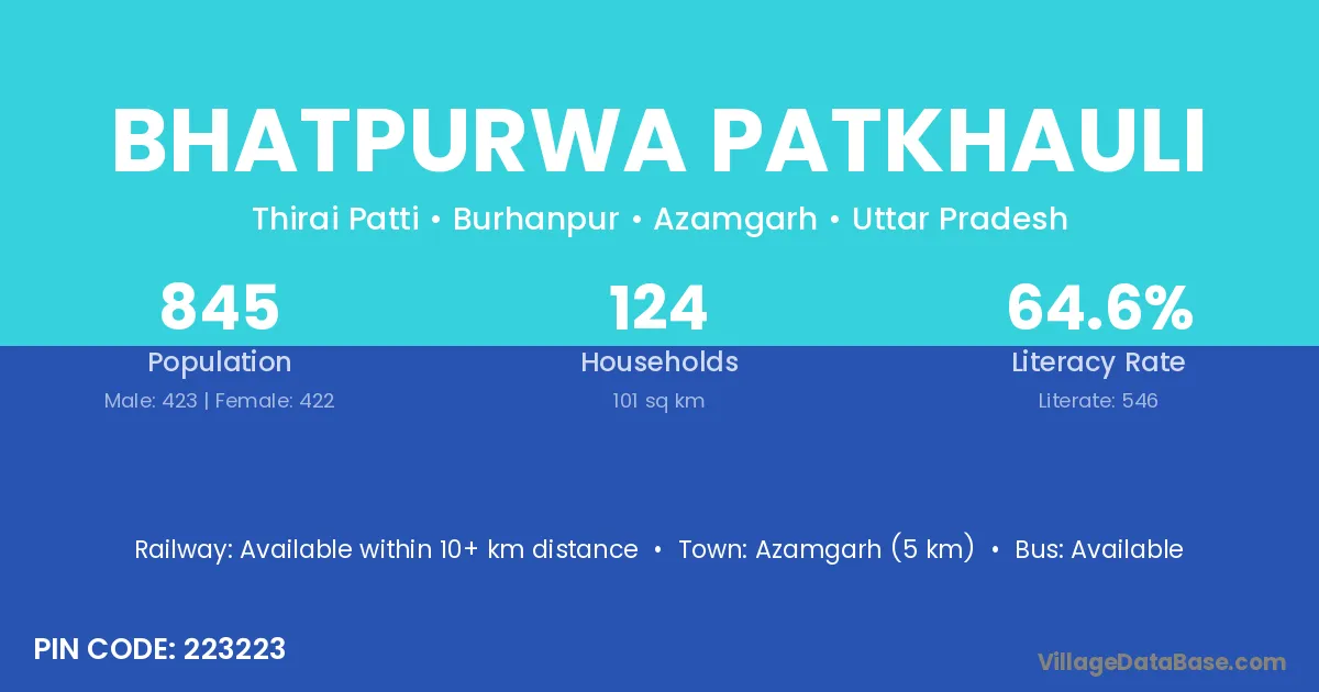Azamgarh (5 km) is the nearest town to Bhatpurwa Patkhauli village for major economic activities and is located approximately 5 km away.