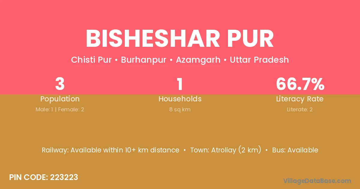 Atroliay (2 km) is the nearest town to Bisheshar Pur village for major economic activities and is located approximately 2 km away.