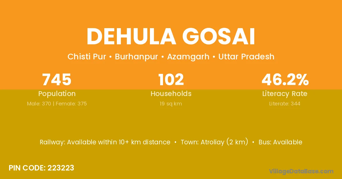 Atroliay (2 km) is the nearest town to Dehula Gosai village for major economic activities and is located approximately 2 km away.