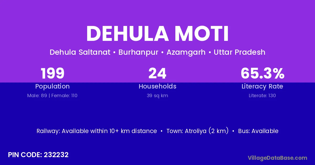 Dehula Moti village has a total population of 199 people, of which 89 are males and 110 are females.
