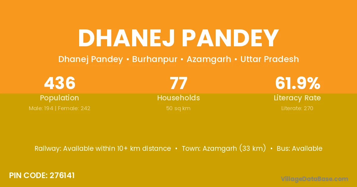 Azamgarh (33 km) is the nearest town to Dhanej Pandey village for major economic activities and is located approximately 33 km away.