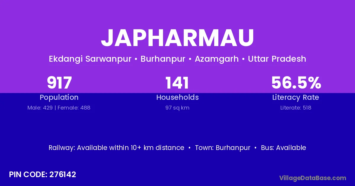 Japharmau village has a total population of 917 people, of which 429 are males and 488 are females.