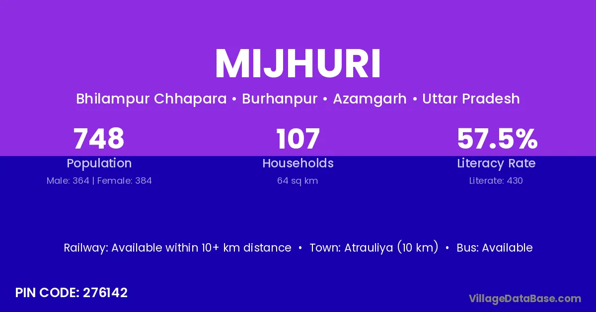 Atrauliya (10 km) is the nearest town to Mijhuri village for major economic activities and is located approximately 10 km away.